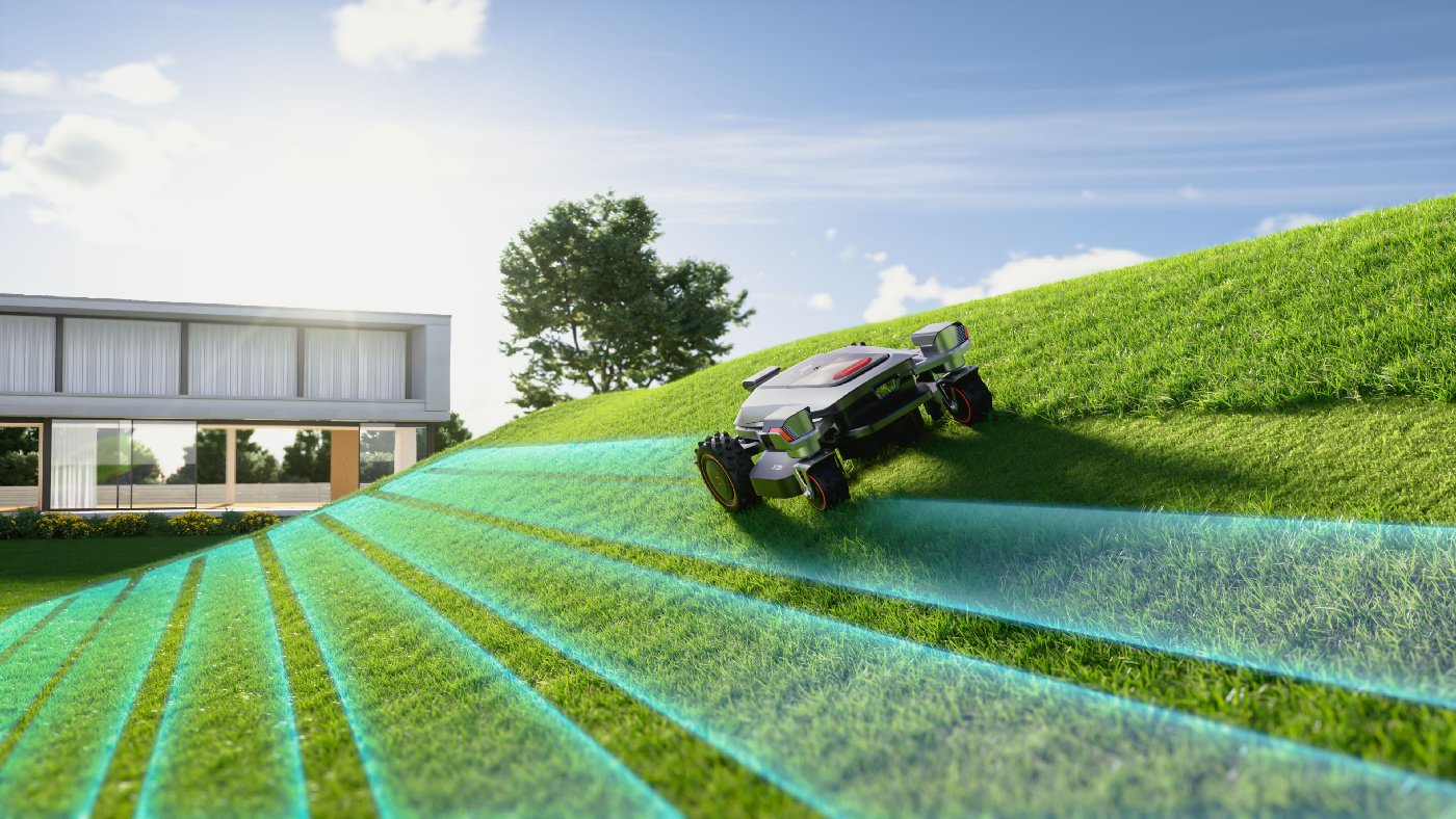 • Über das eingebaute GPS-Modul erkennt das Gerät, welche Flächen schon gemäht wurden und fährt dann gezielt noch ungemähte Flächen an.